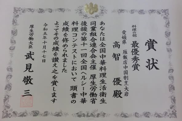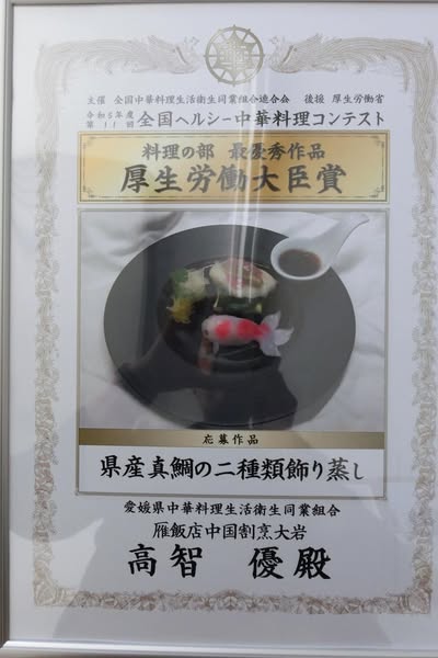 併催された全国ヘルシー中華料理コンテストにて、愛媛県から高智優氏が料理の部で厚生労働大臣賞を受賞されました。