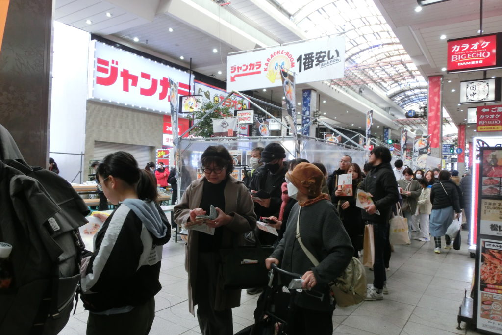 “ヒメカラ”と“えひめのフルーツ杏仁豆腐”の2品を100食ずつ用意していましたが、先着100名の方々で長い行列ができてあっという間に配り終わりました。試食された皆さんから「やわらかくてとても美味しい」と大人気でした。