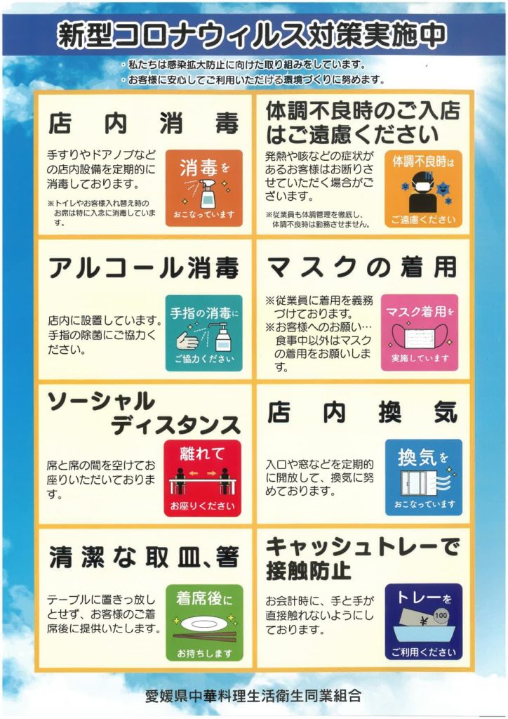 私たちは令和 2 年 5 月 14 日策定、令和2年11月30日改正された『新型コロナウイルス感染症対策の基本的対処方針(改正)に基づく外食業の事業継続のためのガイドライン (一社)日本フードサービス協会・(一社)全国生活衛生同業組合中央会』に沿った感染拡大防止に向けた取り組みを次の項目で実施して、お客様に安心してご利用いただける環境づくりに努めます。